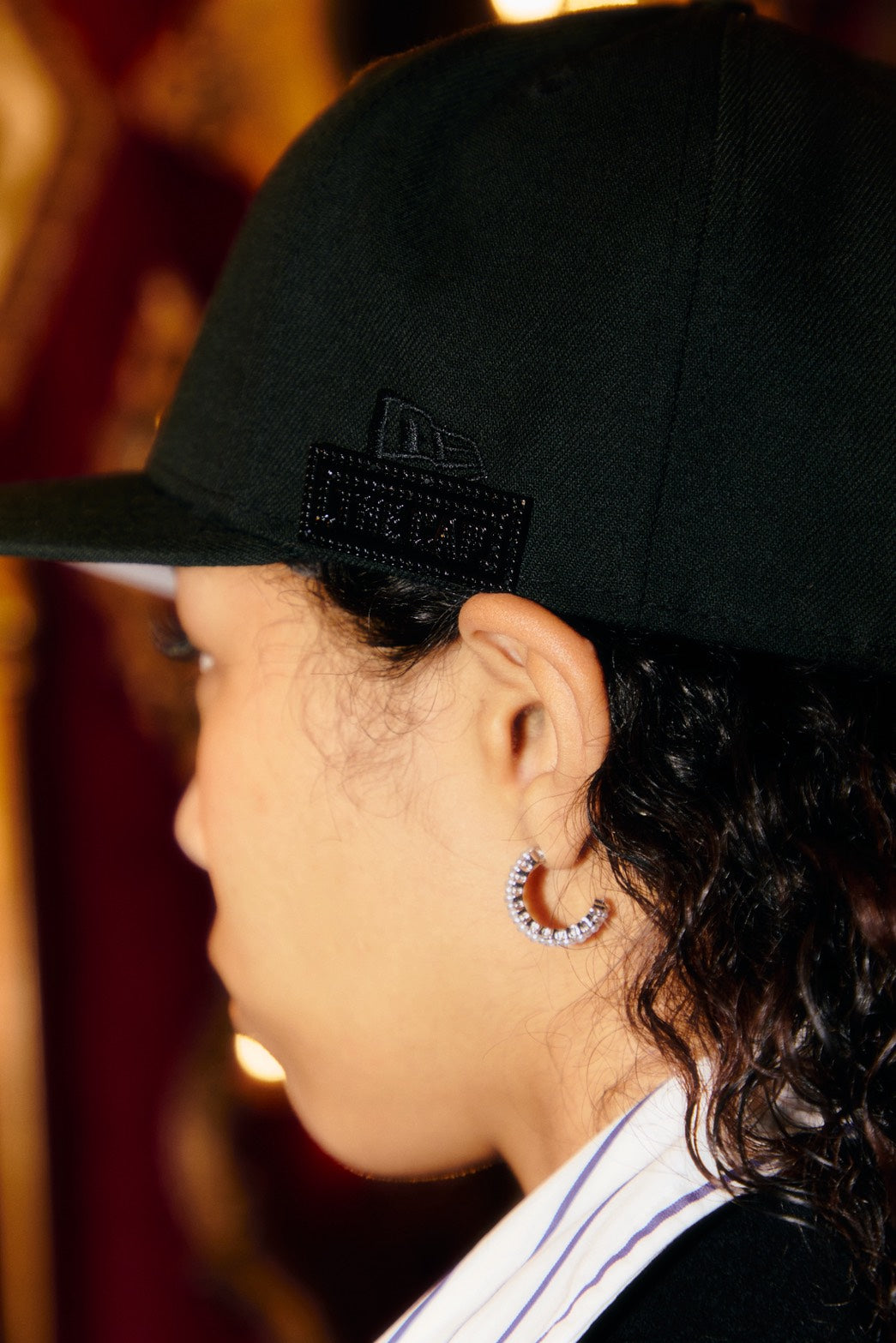 存在感のあるフレームロゴをラインストーンで縁取り、光を受けるたびに表情を変えるリッチな仕上がりとなった。キャップのどこに添えてもコーデの空気感を一段引き上げる汎用性の高いアクセントになっている。